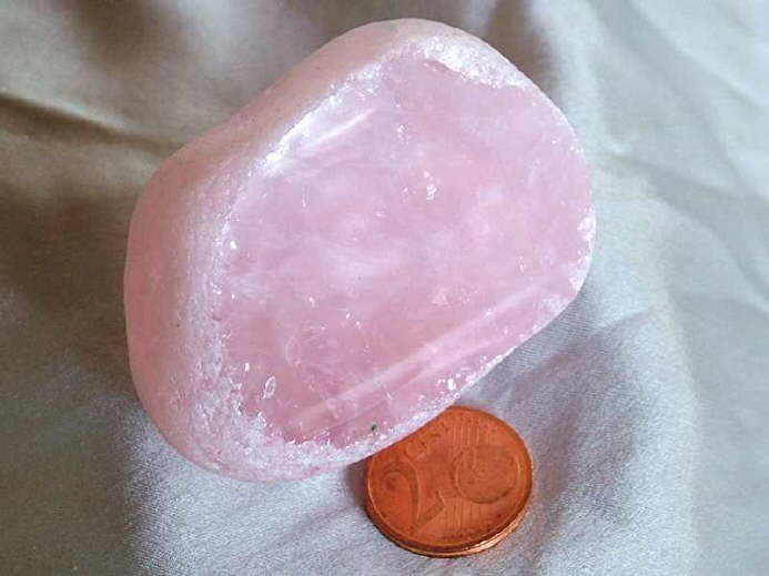 Rosenquarz-Handstein in Flusskiesel Form, einseitig poliert