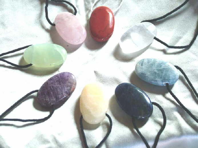 Flache polierte Stein-Anhänger mit Bohrung, unterschiedliche Arten Hier von oben im Uhrzeigersinn Bergkristall,:Blaucalcit, Dumortierit, Orangencalcit, Amethyst, Serpentin, Rosenquarz, Roter Calcit Besonderes Angebot: Sieben Steine bezahlen, acht bekommen! (Ansonsten Preis je Stück)